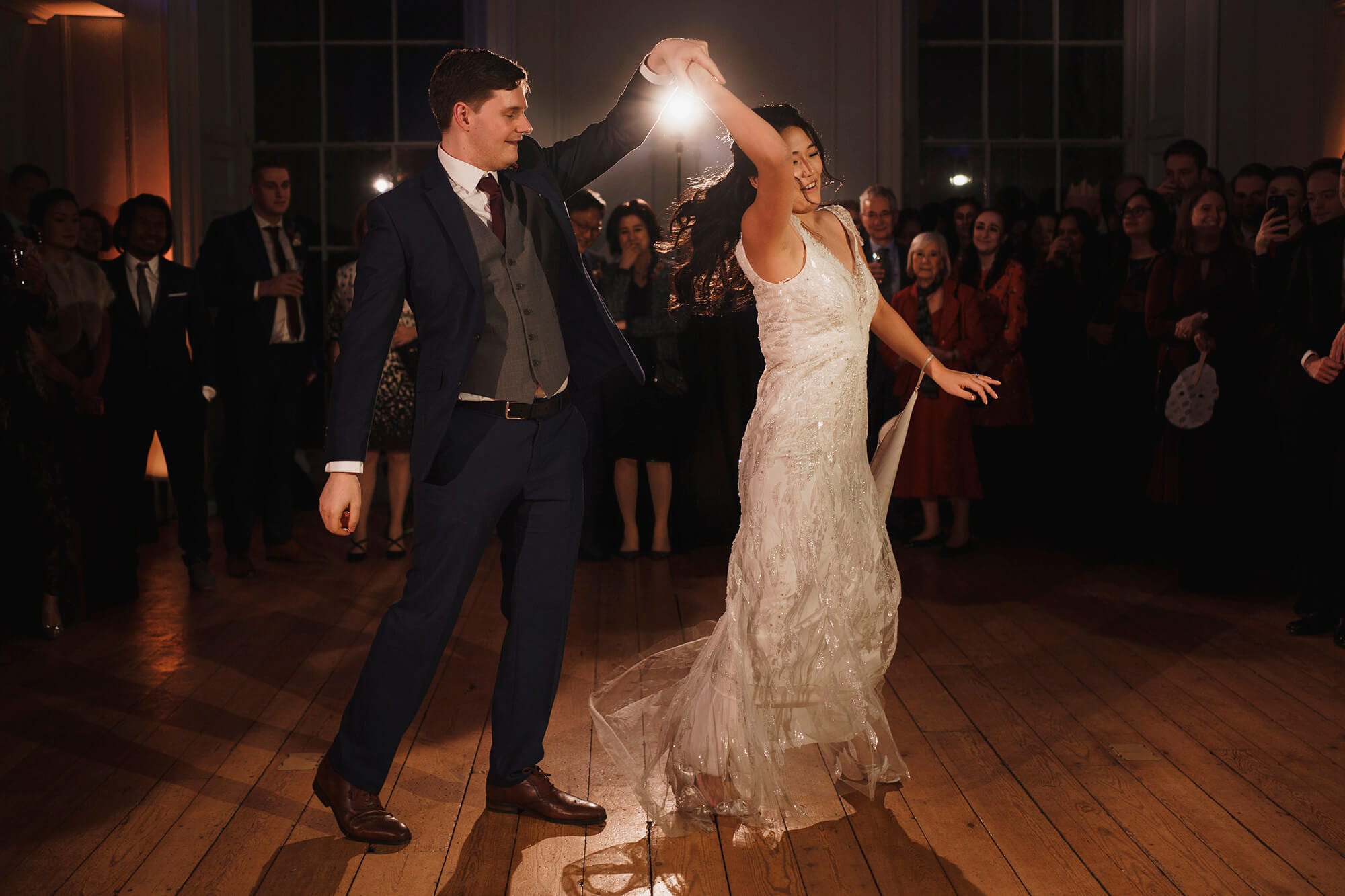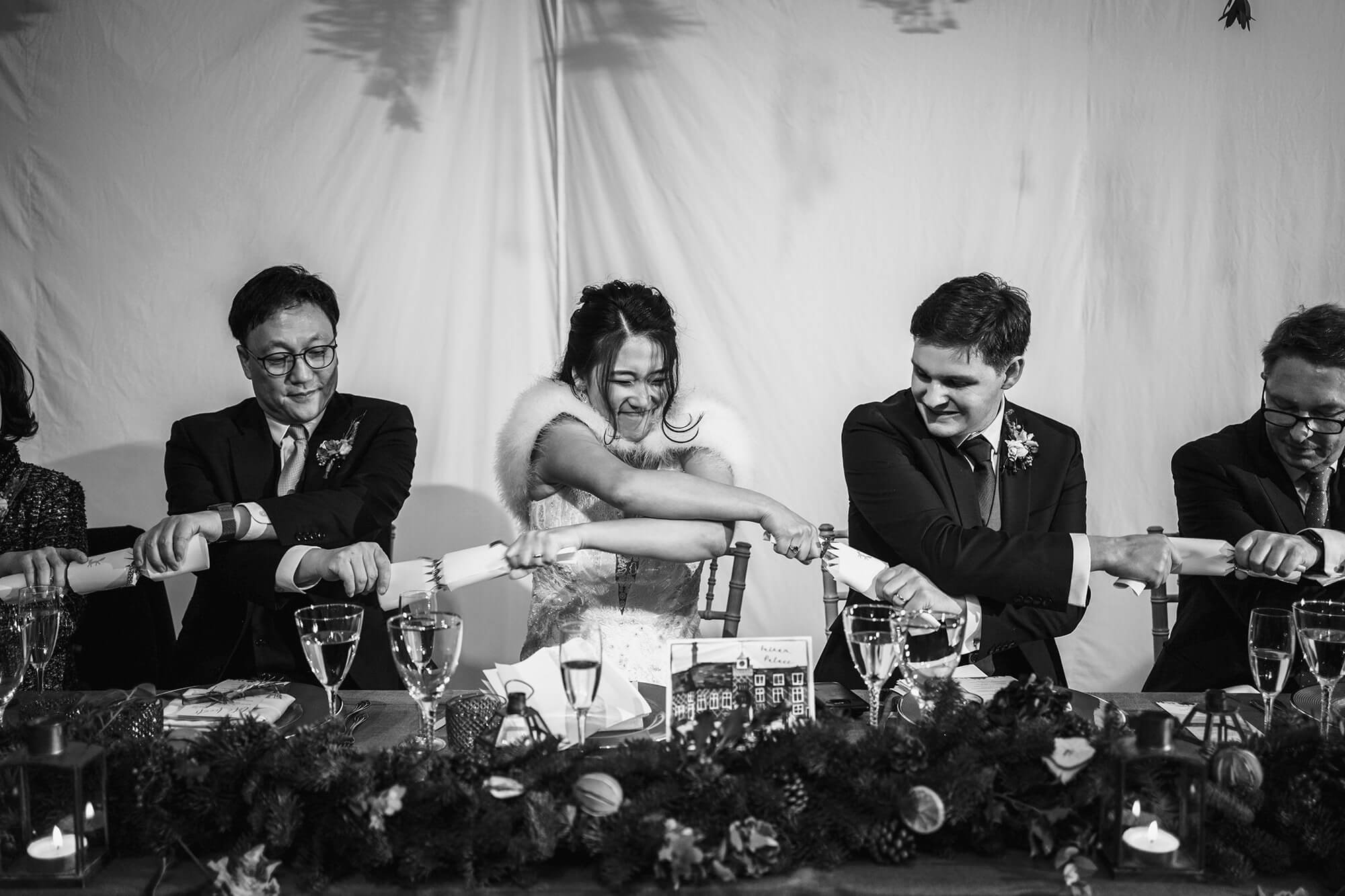 Yoon and Toms evening reception was full of smiles laughs, masks and plenty of fun. Even though most weddings follow a similar format I always love how individual and unique they are. This always boils down to the people. There are always so many fun people that make weddings what they are. Especially wheat comes to the evening reception. A huge mention of the father of the bride and the bride dance as they danced to the song Gangnam Style! The energy was high the atmosphere was amazing and it was an all round pleasure to shoot this winter wedding at Fulham Palace. Yoon and Tom are super nice people and to have been able to capture this part of their history for them is something I’m incredibly proud of. Hopefully our paths will cross again and I get to see Tom “pull that face” behind Yoons back!